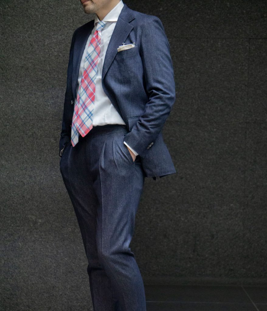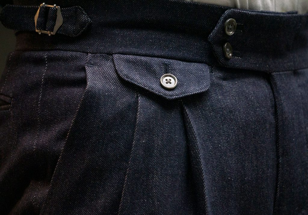 トラウザーズは2プリーツがオススメです。ベルトループを排した脇尾錠のタイプもクラシックなデザインでオススメです。