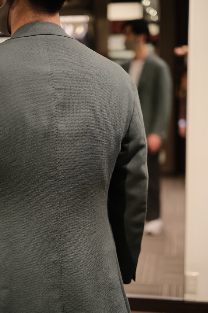 こちらのお客様は強撫で肩、頸部屈伸、肩甲骨の張り強め、細首という体型。どこまで体に合わせるか、デザインのバランスをどうするか非常に悩みましたがしっとりと体に寄り添いつつバランスよく仕上がったかと思います。