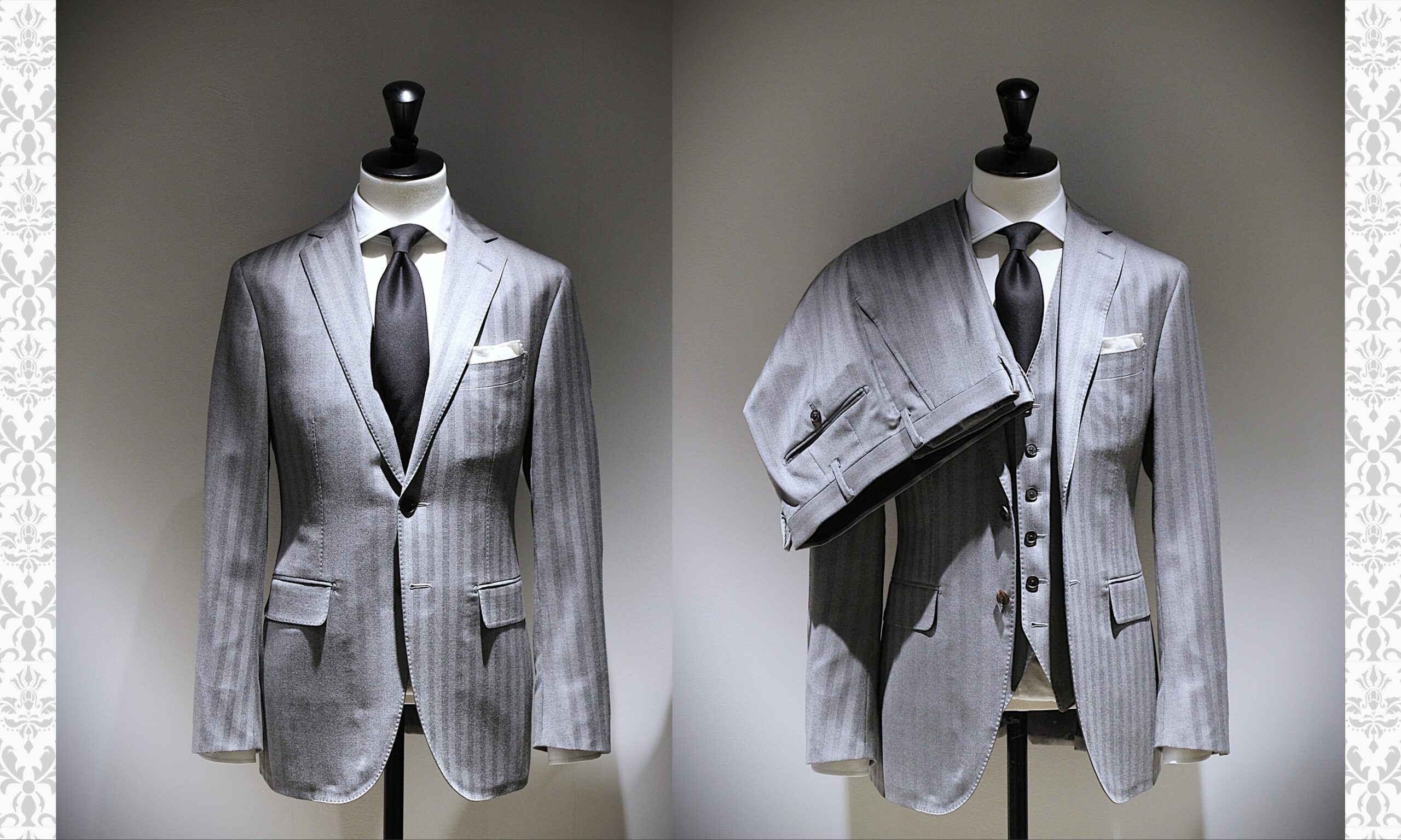スーツは、”現代でもその歴史を日常着ることができる唯一の衣服”です。トレンドはクラシックスタイルのムードですが、着る人それぞれに合わせてクラシックからスタイリッシュ、ブリティッシュからイタリアンの装いまで、現代の多様性にマッチしたお仕立てを一人一人に合わせてお仕立て致します。