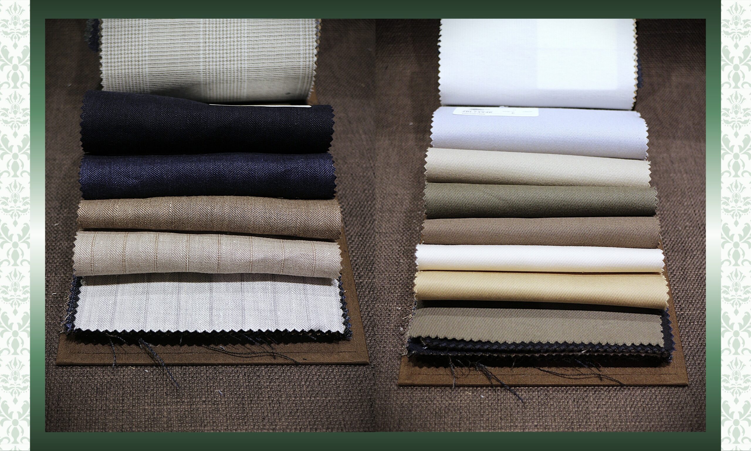 ウールリネン・・・ウールと麻の配合を半々の割合で織られた、麻の雰囲気が強めの生地 (左)